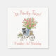 These napkins feature a watercolor portrait of a cute little puppy sitting on a bike with a large bouquet of pink flowers and blue and white bows.