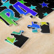 This lively and vibrant birthday-themed jigsaw puzzle design features the message "HAPPY BIRTHDAY, CORA" with the characters having a colourful rainbow spectrum inspired gradient pattern, along with a fun star field background pattern. A vibrant puzzle like this might be used to send a birthday greeting message to somebody named Cora. [~Z0000468]
