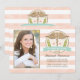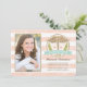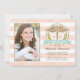 Add your favourite photo to these pretty, pale coral and white striped veterinary school graduation announcements and party invitations with a single snake caduceus symbol and a green laurel wreath and the letters DVM below it. Customise the aqua blue hued banner with the year of the graduate's graduating class year and your own wording on the back. The watercolor look peachy pink background is soft and feminine. A faux glitter look design outlines the circular logo and graduate's picture. The party invite can be personalised the future vet's graduate's name, degree, ceremony and party details. A future veterinarian graduating from a school of veterinary medicine is sure to love these invites and announcements. Please, note, no 3D embellishments have been added to this invitation. The artwork was created to simulate the look of glitter and texture. Artwork and design © Chrissy H. Studios, LLC. All rights reserved. Photo credit: Susie Moore Photography