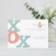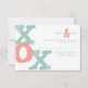 This coral peach pink and mint green or teal blue or sea foam modern wedding response card features the letters XOX sybolizing hungs and kisses for a whimsical, romantic and chic stylish announcement. The bold look gives this spring wedding invitation a fun and artistic feel and can also be used for bridal shower or wedding shower invites and vow renewal and anniversary party invites.