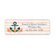 Coral and navy blue nautical wedding, bridal shower, couples shower, anniversary or engagement party return address labels with an anchor with a coral heart hanging off its rope and coral flowers and yellow roses with green leaves make up the floral elements of this lovely seaside themed design. A coral and white watercolor look striped background complete this by the beach look address sticker. Artwork © Chrissy H. Studios, LLC. All rights reserved.