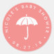 Seal your baby shower invitations or favours with these cute stickers in vibrant coral pink, featuring a white umbrella illustration with circular text to personalise with the guest of honour's name and baby shower date.