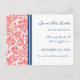 Wedding save the date announcement postcards in elegant and contemporary peach orange pink, dark navy blue, and white classic and vintage floral damask pattern, stylish and fully customisable with your wedding details. Also available in many other products for the wedding party.
