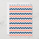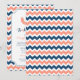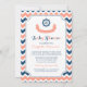 Personalised nautical theme baby shower invitations in elegant and modern dark navy blue, peach orange pink and white fun chevron zigzags pattern with ship wheel and banner. Customisable with your text, contact us to request a colour change.