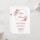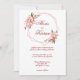 A timeless invitation featuring a geometric hoop surrounding your names. The hoop is adorned with coral, red and blush floral elements. Your first names are featured in an elegant red script font. Last names and other details appear in classic, sophisticated serif font. The back features your names and wedding date framed by a floral bouquet.