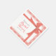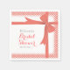 This bridal shower paper napkin features a design that looks like an elegant gift. The background is a coral colour with a white dot pattern and the napkin has a graphic of a coral ribbon tied into a bow. The centre of the napkin is white and features customisable text for the bride's name and shower date.