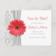 Coral gerbera daisy silver grey and white damask floral wedding wedding save the date postcard. The colours on this coral gerber daisy wedding save the date postcard are silver grey (grey), coral (salmon), and white.