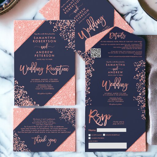Elegant coral glitter confetti and colour block typography on customisable navy blue and faux coral foil geometric stripes chic wedding , perfect for elegant, luxurious wedding,