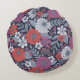 This round pillow features zinnias surrounded by other flowers and leaves in shades of coral, white, magenta, and blue on a navy blue background.