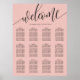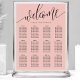 Organise your wedding reception in style with this elegant coral seating chart. The design features a modern, hand-lettered "Welcome" script paired with a clean serif font for guest names and table numbers. The vibrant coral background provides a beautiful pop of colour that complements a variety of floral arrangements and venue styles. This layout is perfectly structured to help your guests find their seats quickly and easily during the cocktail hour or entrance. It is an ideal choice for couples looking for a sophisticated, minimalist aesthetic for their big day.