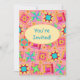 Invite a quilter or quilt lover with this colourful fully customisable quilt invitation. Fully customise on the front and back to add your own words, names and other information. This original quilt art makes a vibrant invitation. Quilt art based on original art features favourite patchwork quilt blocks plus unique blocks in vibrant and dynamic colours of orange, yellow, pink, turquoise, and lime green on a coral orange background for a beautiful colour palette. A sunny yellow oval is on the front of the card to say "You're Invited" or other words of your choice. Show your love of quilting with these quilt art designs with other quilt art products. Quilt art is original art from fabric and quilt designer Phyllis Dobbs and is in a fabric collection from Quilting Treasures. This art is available on other products and in several colour backgrounds. More products are available in Phyllis' BusinesswithFlair store. Match with coordinating stamps, envelopes, stickers and return address labels.