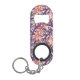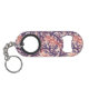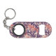 Keychain bottle opener with a pattern of overlapping corals in dark purple, orange red, and peach.