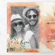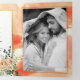 Coral peach watercolor flowers and leaves floral winter tri-fold wedding Invitation. This elegant design showcases a gold frame and coral peach watercolor flowers with succulent and eucalyptus leaves on the upper left and bottom right corners and your text in gold and black on the cover. The inside first and last panels as well as the outside flap include photos of the couple while the inside middle panel displays your wedding details. The outside back showcases details about RSVP and more.