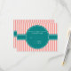 The design features an alternating coral pink and white stripes pattern on the background. An elegant striped pattern and in the middle there is a teal circle where to add your text.