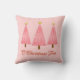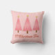 Throw pillow in a modern take on a classic Christmas tree motif - three trees in a coral, pale pink and deep pink ombre pattern, with the text "O Christmas Tree"