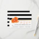 This gorgeous floral wedding RSVP response card showcases a lovely poppy flower and a black and white striped pattern. Your text is on a white band with a gold stripe.