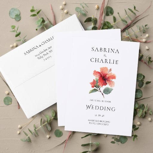 Elegant coral red hibiscus wedding invitations. Our tropical collection features minimalist modern and boho watercolor designs with green foliage for a spring or summer Hawaiian wedding.