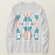 Featured is an abstract, geometric mosaic-like design in shapes and lines, symmetrically arranged, of light coral orange and turquoise with rust elements, arranged in a perpendicular pattern, with inspiration from the Native American and Southwest styles. Pictured here on an ash grey, long-sleeved t-shirt, with other colours and styles available. This is a trendy, energising but also calming look, suggestive of tribal art, a mosaic tile pattern, or modern art image, to perk up your casual and everyday wear, whether hanging out at home or with friends, playing sports, or going about town. Given the shirt lends an artistic vibe and individualised style, this contributes to a feeling of being "put together," especially invigorating for those who work remotely and/or spend a lot of time at home.