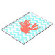 A coral-orange silhouette of sea coral is on a background of white and sky blue zigzags.