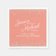 Coral wedding reception (bridal shower, rehearsal dinner, etc.) paper napkins with silver glitter and white text. Personalise with the couple's names, wedding date and location.