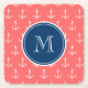 Coral White Anchors Pattern, Navy Blue Monogram Square Paper Coaster