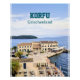 The Corfu Greece poster. The Greek island with beautiful beaches surrounded by palm trees is perfect for the next seaside holiday. In the background, the sea and the mountains.