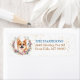 The left side of these return address labels feature an image of a spring flower wreath in colours of soft pink, blue, gold, green and cream. At the centre is a beautiful portrait of a Pembroke Corgi dog. Tiny gold confetti gives a subtle sparkle to the background. Your custom text is in blue and brown gold at the right.