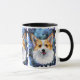 Anyone who has lost their heart to an adorable Corgi Dog will love this attractive mug! It features an artist rendering of a Pembroke Welsh Corgi looking out from an abstract painted background. The predominant colours in the background are black, blue, lavender, with a touch of aqua. The warm and cool colours in the dog portrait stand out beautifully from the background. The image is repeated around the mug, and the centre image has custom text in black script that says "Corgi". You may customise the text, personalise it, or even remove it if you prefer.