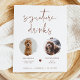 This signature drink sign features two photo slots, an edgy handwritten font, and a modern minimalist design and a boho rust and white colour combination. Easily change the font and background colour to match your event. This sign is perfect for adding either a photo of the bride and groom, kiddos, or your favourite family pets.