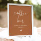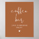 printable coffee bar sign template features a an edgy handwritten font and modern minimalist design with a terracotta and rust colour combination. Use this sign for your wedding reception, bridal shower, retirement party, etc. Edit *most* wording to meet your needs. Pair with additional items from the CORIANDER Collection for a cohesive look