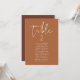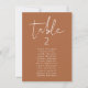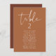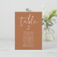This table number seating chart features an edgy handwritten font and modern minimalist design with a boho terracotta, rust and white colour combination. Easily change the number and the names along with all of the colours to fully match your event.