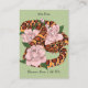 A corn snake is coiled up with three pink flowers in a backdrop of light green all drawn in a tattoo style.
