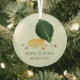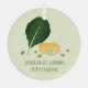 A food Christmas ornament that shows a cornbread character and a collard green leaf character both smiling while surrounded by black eye peas. The words are customisable.