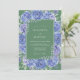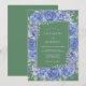 This design showcases an abundant border of watercolor roses and hydrangeas in shades of cornflower and periwinkle blue. A solid sage green backdrop provides a sophisticated contrast to the lush floral arrangements and delicate leafy greenery. The overall aesthetic is romantic and elegant, perfect for a refined springtime event.