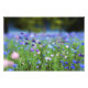 A field of cornflowers in shades of deep and pale blue, purple, lavender, and pink, with pale green leaves.