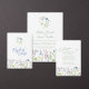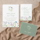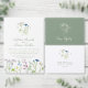 Monogram crossing hartwort and cornflower botanical line art wedding landscape invitation on sage green with simple white art and text. Personalise with your own initials, names, wedding date, time, venue, and further details. Original hand drawing and design by Sarah Trett for www.mylittleedenweddings.com