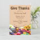 Grapes, apples, an orange gourd, other fruits and floral arrangements, including black-eyed Susans, are at the base of this "Give Thanks" invitation for Thanksgiving Brunch, Lunch or Dinner. The wording is in a deep brown against a pale peach coloured background. Interesting contrasting fonts, script and serif, have been selected for the text. Each line is easily changed when you swap your information for our placeholder info. Just hit "Personalise" and your details.