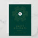 Send season’s greetings in style with this corporate Christmas holiday card template featuring a festive green background, real gold foil snowflake design, and your custom company logo in the centre. Perfect for businesses wanting to spread holiday cheer to clients, suppliers, and employees, with elegant serif fonts, a personalised “Happy Holidays” message on the front, and space on the back for a custom note and your website (you can also remove the message on the back if not required).. You can choose from gold, silver and rose gold foil.