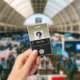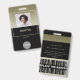 A classy, black and gold business design that is fully customisable, front and back. Professional, elegant, stylish, with a touch of modern textures on a gold background. Personalise this custom employee ID name badge with a photo, scan bar code and the business logo. Available with lanyard, metal clip or with retractable. No minimum order.