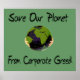 Planet Earth is cradled in a loving pair of hands with the words "Save our planet from corporate greed." Without our help the planet will be destroyed by climate change and global warming brought on by the selfishness of corporate greed.