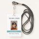 Corporate style employee photo ID badge featuring a simple design. Your company logo is at the top, your photo or QR code is in the middle and below is your name over a turquoise / teal coloured band along with your your title below that. The back has a template field for optional text such as your business contact information. The colours of the band and text may be changed in the design editing tool.