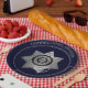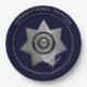 Correctional Officer Badge (Paper Party Plates)-is a graphic art design. The badge is created in silver (or gold) and black with a small touch of blue. A decorative seven (7) point silver/gold star forms the badge. Text curving the top of the badge reads: DEPARTMENT OF CORRECTIONS. Text curving the bottom reads: CORRECTIONAL OFFICER. These words sit on a solid blue/black ring. More silver/gold decorates the badge throughout. An eagle emblem with silver/gold stars sits in the centre. Smaller text in the centre reads: Seal of the State. The badge is not state specific. Under the badge is a solid blue centre. A blue outer rim with silver/gold text curving around the top that reads: CORRECTIONAL OFFICER. This badge design comes in silver or gold with assorted background styles. The design is also available with a photo insert in my other zazzle stores.