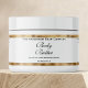 A cosmetics jar label featuring a faux woven gold and white background. This label measures 8.25 inches by 1.75 inches (209 mm by 44 mm) and is suitable for jars with a diameter of 2.6 inches (66 mm) or more and a label height area of at least 2 inches (50mm). Most 8 oz (240 ml) and 16 oz (480 ml) jars fit this description, but check the jar specifications to be sure. This label makes a great choice for packaging beauty products that require larger labels like sugar scrubs, body butters, and thick lotions and creams.
