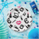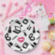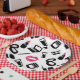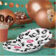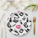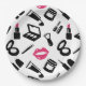 Paper plates in black, white, and pink featuring a pattern of cosmetic products like lipstick, nail polish, foundation, eye shadow, mascara, and more.