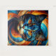 A striking digital artwork of a cat's face, featuring vibrant colours of blue, orange, and gold. The swirling patterns around it create a dynamic, cosmic feel, emphasizing the cat's expressive eyes.