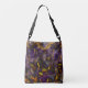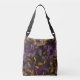 The abstract pattern by ZoeSPEAK on this crossbody Tote Bag is an original design of golden and warm brown shapes on a dark purple background, with textured bluish grey cloud shapes floating through the scene.