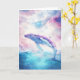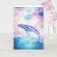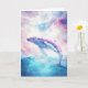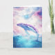 A majestic humpback whale gracefully swims through a tranquil ocean, surrounded by a swirl of pastel hues in shades of purple, blue, and pink. The whale’s body shimmers with a cosmic glow, blending seamlessly with the magical atmosphere of stars and mist that fills the background. Its movements create gentle ripples in the serene water, adding to the ethereal, dreamlike quality of the scene. The soft colours and peaceful vibe evoke a sense of wonder and tranquillity.