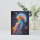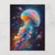 This surreal image features a vibrant jellyfish floating through a cosmic space setting. The jellyfish's translucent bell showcases bright hues of blue, pink, orange, and yellow, with its tentacles trailing behind in a cloud-like formation of similar colours. Surrounding the jellyfish are celestial bodies, including planets and stars, creating the impression of it drifting through space. This artwork beautifully merges marine life with outer space, resulting in a visually striking and imaginative piece.