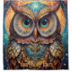 A vibrant, symmetrical depiction of a majestic owl, intricately designed with colorful swirling patterns and intricate details. The owl's eyes are large, glowing in shades of emerald green, framed by vibrant feather-like motifs in hues of turquoise, teal, and orange. The feathers appear as a blend of abstract shapes and ornate, paper-cut style elements that enhance the image’s artistic and surreal appeal. The owl embodies a sense of wisdom and mystery, making it a captivating, decorative image suitable for various merchandize.