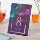 Cosmic Purple Teal Gold Sun Moon Astronomy Wedding Table Numbers Pedestal Sign features gold sun, moon and stars with a golden frame on  colourful mystical purple, teal and blue cosmic background. Inside is your custom table number information. Designed for you by Evco Studio www.zazzle.com/store/evcostudio
